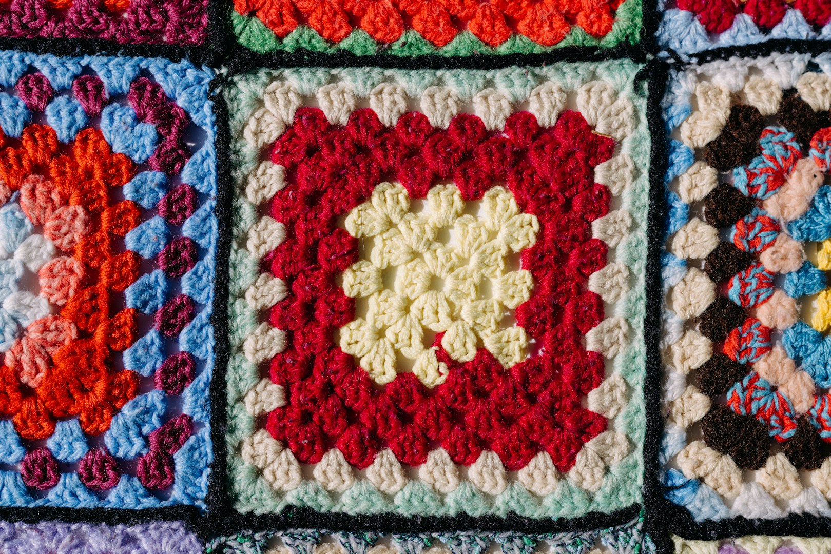 Duizenden haakwerkjes vormen samen een kleurrijk en feestelijk geheel, als symbool voor aandacht en verbondenheid.